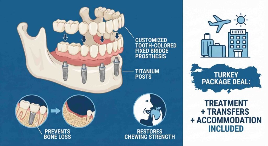 Full mouth dental implants replace all missing teeth using 4–8 titanium posts per arch, supporting a fixed bridge. They prevent bone loss, restore full chewing strength, and eliminate denture problems. This option is often included in full mouth dental implants Turkey package deals, which bundle treatment, transfers, and accommodation.